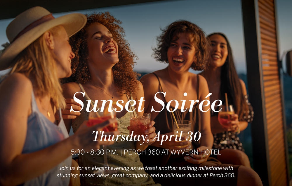 Join us for an elegant evening as we toast another exciting milestone with stunning sunset views, great company, and a delicious dinner at Perch 360.